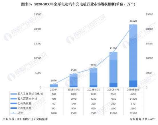 到2030年,全球充电桩预计保有量将分别达到12090/21520万个,其中全球私人充电桩预计保有量分别达10470/18990万个,全球公共充电桩预计保有量达1620/2530万个。