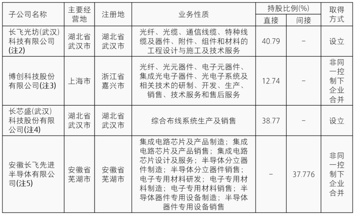 注2:于2022年12月31日,本公司对长飞光坊(武汉)科技有限公司(以下简称“长飞光坊”)及其子公司持股比例为40.79%,持有长飞光坊的表决权低于50%,但基于如下原因,本公司管理层认为本公司能够对长飞光坊实施控制并将其纳入合并范围:与合计持有长飞光坊13.16%股权的股东包括武汉楚坊佳盈企业管理合伙企业(有限合伙)、武汉楚坊佳成企业管理合伙企业(有限合伙)、武汉楚坊佳泰企业管理合伙企业(有限合伙)、武汉楚坊佳宁企业管理合伙企业(有限合伙)、武汉楚坊佳雅企业管理合伙企业(有限合伙)签署了一致行动协议,取得了全部该等13.16%股权的表决权,合计持有代表53.95%股权的表决权。