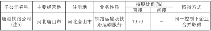 注5:于2018年12月,本公司收购太原局集团公司持有的唐港铁路公司19.73%股权,合并成本为人民币15.76亿元。本公司收购唐港铁路公司的股权后,由于唐港铁路公司的实际经营依赖于本公司,而且其他股东国投交通控股有限公司(持股比例15.13%) 、唐山曹妃甸实业港务有限公司(持股比例15.13%) 和河北建投交通投资有限责任公司(持股比例11.64%) 也同意与本公司在股东会和董事会上就相关事项行使表决权时与本公司保持一致,因此本公司管理层认为本公司能够主导唐港铁路公司相关活动,对其具有控制权,并将其纳入合并范围。