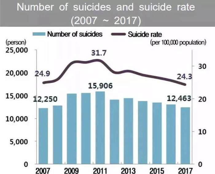 韩国2007年~2017年自杀人数及自杀率