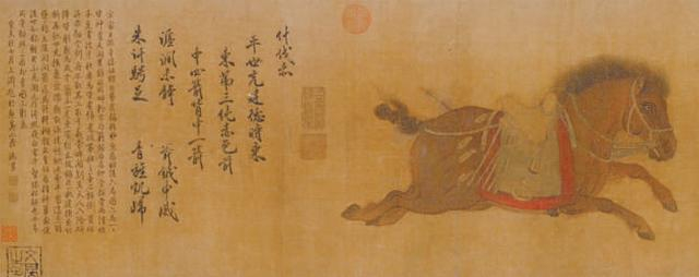 金代赵霖作《昭陵六骏图》卷,为其存世孤本。每段题赞为金代书法家赵秉文所写,赵的流传书迹也甚少。