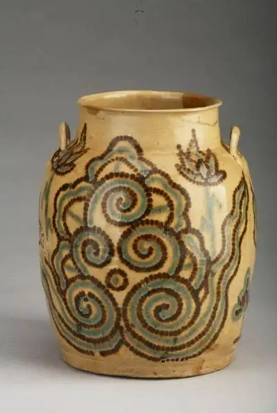 扬州 唐青釉褐绿点彩云纹双耳罐