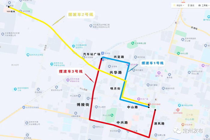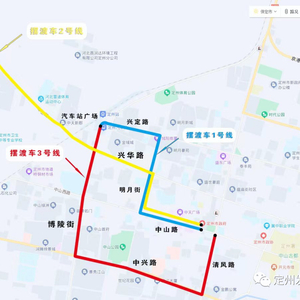 摆渡3号线:火车站—博陵市场—中兽医学院—西城派出所—紫芳园小区—天然气公司—中山公园南门—水利局(通达小区)—人民医院南门—种子公司—公安局—财政局—清风街中山路交叉口
