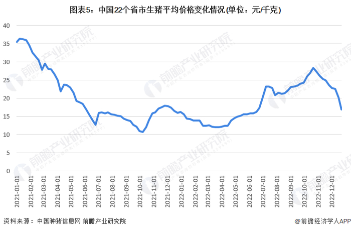 生猪平均价格波动下降。2021年以来,中国22个省市生猪平均价格整体呈波动下降的发展趋势。2021年1月起,受生猪存栏恢复、出栏增长、消费下滑等多重因素影响,22个省市生猪平均价格快速下跌,最大跌幅超七成。虽然10-11月由于季节性因素小幅反弹,但2022年初冬季疫情的反复又使各地加大了封控的力度,猪肉需求减少,生猪价格进一步回落。2022年3月-10月,中国22个省市生猪平均价格呈现波动上升的发展态势,2022年10月21达到28.32元/千克。之后不断下跌,2022年12月23日,跌至16.97元/千克。