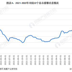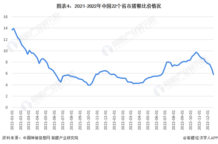 据前瞻产业研究院报告数据显示,2021年以来,中国22个省市猪粮比价格整体呈波动下降的趋势,从2021年1月1日的13.67下降至2022年12月23日的5.77。2021年以来,国内猪价回落,饲料成本攀升,猪粮比价大幅下跌。生猪养殖企业利润缩水,亏损风险加大,养殖户补栏意愿再次下降。2022年国内生猪市场产生“猪贱伤农”问题,生猪产能被破坏后导致新一轮猪肉价格上涨和猪肉进口增加。如何破解“猪周期”给猪肉市场供给及猪肉贸易的稳定造成的破坏仍然是一个具有挑战性的课题。