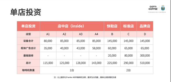 根据库迪咖啡的招商宣传资料,库迪对单店投资额(包括设备、柜体广告、基础装修)的预估在11.5万元-51万元之间,按照规模大小分为店中店、快取店、标准店、品牌店四类,所需费用依次递增。