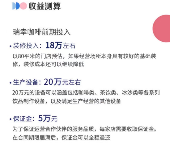 与之相比,瑞幸的加盟费用门槛更高,官方资料显示,其不包括房租的前期投入预计达43万元。