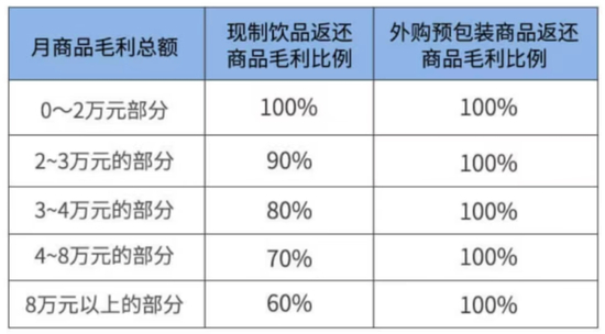 瑞幸向联营商收取的服务费用也更高。门店月毛利超三万元后,瑞幸抽成比例较库迪梯次增加5%-15%不等。最高一档8万元以上毛利,库迪抽取25%,瑞幸抽取40%(官方图中显示返还60%)。