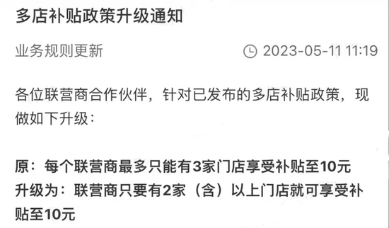 但是,《财经十一人》观察到,低价促销可以迅速拓展市场,但是长期执行则联营商不堪重负。因此,库迪3月底以来多次发布、更改补贴政策。目前,拥有一家店的联营商,每一杯咖啡的实收金额如果低于9.5元,库迪都将以9.5元的金额与之结算;对于拥有两家及以上门店的联营商,价格线提高到10元。这也间接鼓励联营商多开店,多拿补贴。