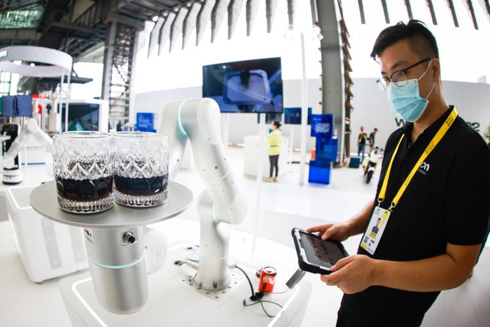非夕科技的两只机械手臂展示“绝活”。其中,一只机械手臂正举着三个水杯大幅甩动,水杯位置却纹丝不动。(海沙尔 摄)