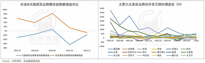 如此对品牌来说,一定程度上意味着以往作为红利基地的抖音,能提供的增长加速度优势减弱。这在数据上已有反映——可以看到,国货品牌在抖音、天猫上的整体销售额增速差距,在明显缩小。
