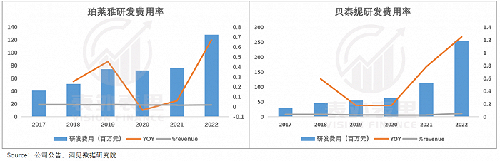 当然,和其他消费品一样,美护的大单品也不是一锤子买卖,而是要不断更新迭代,这对研发投入是不小的考验。可以看到,2022Q1-Q3珀莱雅的研发费用同比大幅增长;贝泰妮也呈现相似的趋势。