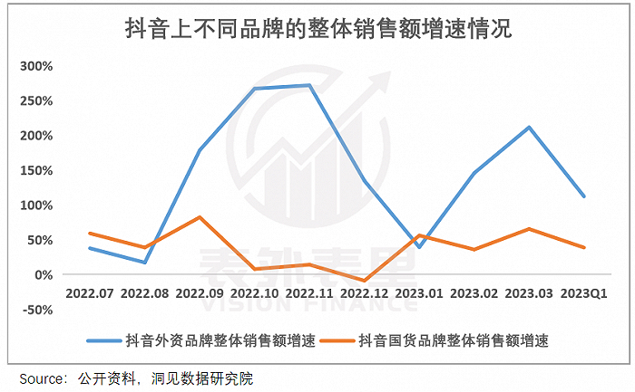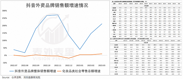 渠道侧重偏移、迅速释放红利下,可以看到今年以来抖音上的外资品牌销售额,出现高增长态势;同时,2023Q1排名前14的品牌,在抖音也基本处于高位数增长。