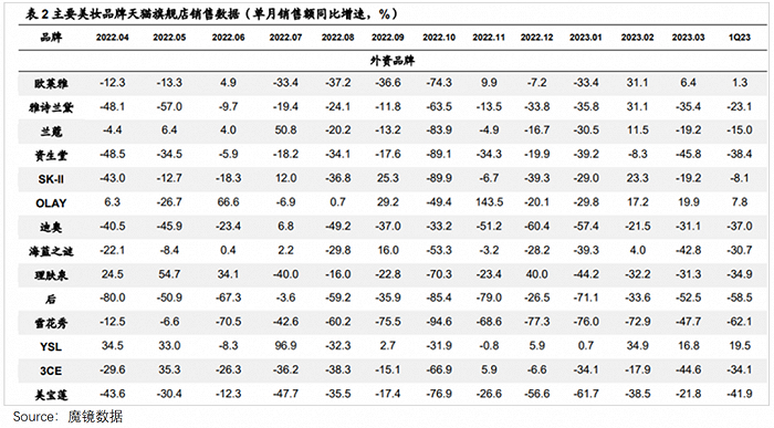而三分之一以上销售额来自复购的天猫渠道,也显然受到冲击,2022年以来大多时候,都是同比负增长状态。(据2023年3月专家纪要显示:2022年巴黎欧莱雅在天猫销售的会员占比约为30-40%,雅诗兰黛为35%左右。)