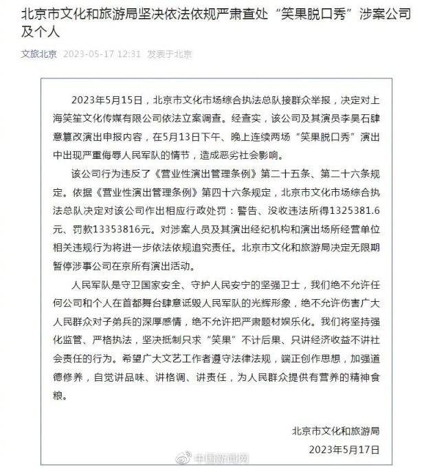 北京市文化和旅游局在5月17日公布的处罚中明确,“希望广大文艺工作者遵守法律法规,端正创作思想,加强道德修养,自觉讲品味、讲格调、讲责任,为人民群众提供有营养的精神食粮。”上海市文化和旅游局也要求“笑果文化”必须诚恳接受观众批评和媒体舆论监督,必须深刻反思此次事件教训,必须举一反三立即整改。