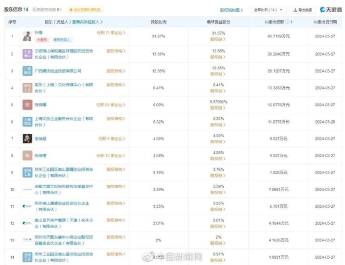 天眼查网站显示,目前,笑果文化共有14个股东,包括:叶烽(持股比例31.57%)、宁波梅山保税港区泽禧股权投资合伙企业(有限合伙)(持股比例13.58%)、广西腾讯创业投资有限公司(持股比例12.55%)等。此外,李瑞超(李诞)持股4.58%,李诞还曾在笑果文化担任高管。