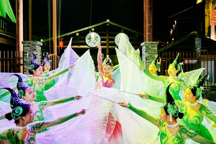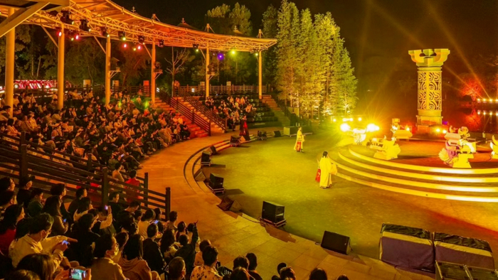 营造“牡丹仙子”、“花萼相辉”等多组主题灯组,及2000多个造型各异的特色灯笼。赏灯同时,弦歌台剧场上演《姜子牙》大型神话歌舞情景秀;拂水山庄上演《如是梦令》古装情景剧。