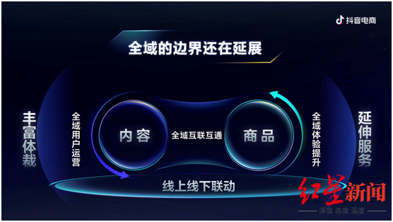 “内容与货架场双场景融合,形成生意增长飞轮,这就是我们独有的优势。”魏雯雯阐述了抖音做电商的底层逻辑:内容场和货架场可以理解为两类用户需求,一类是浏览内容,即货找人的需求;一类是主动去消费、即人找货的需求。短视频和直播组成的内容场景以及抖音商城、搜索、店铺组成的货架场景,都蕴含很大流量。其中,内容与商品是流量的发动机,抖音电商通过产品、策略让所有内容与商品平滑连接,内容场与货架场的流量实现互联互通,同时做好用户运营和用户体验,推动生意“飞轮增长”。