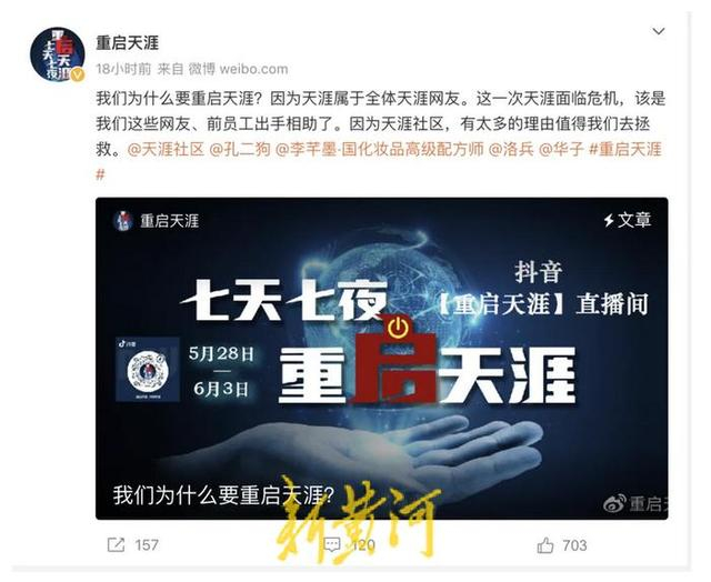 在正式对外公开“重启天涯”计划前,部分老用户已收到邀请。5月13日中午,作家孔二狗发微博称,他收到天涯负责人邀请,“月底要请天涯的故友们去某音上义卖筹款恢复天涯服务器。我想去天涯义卖筹款全是因为十几年前每天就靠着天涯度过一切闲暇时光,更是我发迹之地。”孔二狗称,为了情怀和感情,他愿意脱下长衫。
