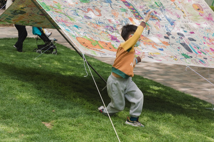 “童年”展区则位于长宁区工人文化宫门前的空地上,这里的摊位以鸟类、鱼虫类为主,汇集了蝴蝶、金鱼、鹦鹉、独角仙等,吸引了许多小朋友驻足。一旁的草坪上还支着由愚园路第一小学的同学们涂鸦而成的天幕,为在这里停留驻足的行人提供荫蔽。