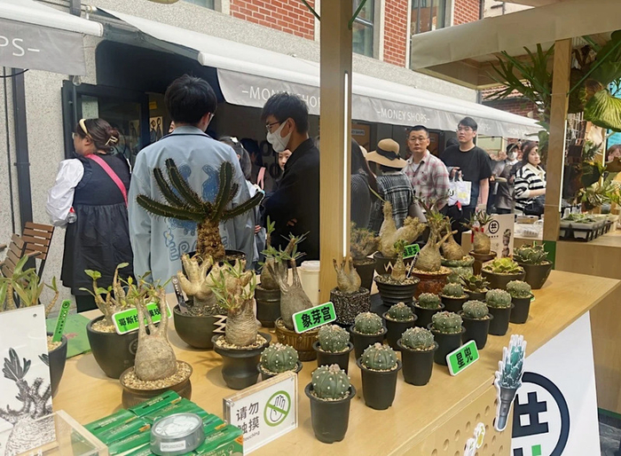 布置在愚巷的“春天”展区设有潮流植物、小众植物、植物衍生品、植物书店和特色花店等。其中,贩售块根植物和鹿角蕨的摊位备受瞩目,吸引了不少年轻人咨询拍照。