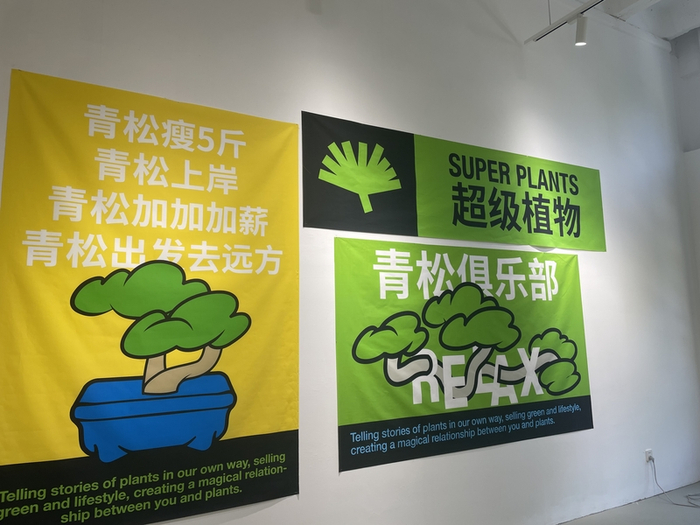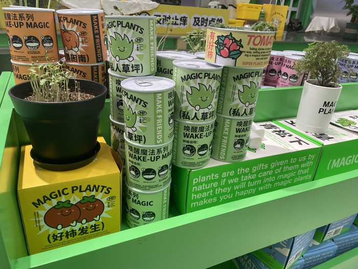 另外,提升植物的附加值也很有必要。在这里,每一个植物产品都会被重新赋予内涵和价值,并用文创设计的形式与植物本体进行结合。例如:松树盆栽被命名为“放青松”,用一种契合当下青年文化的方式让产品迅速破圈。