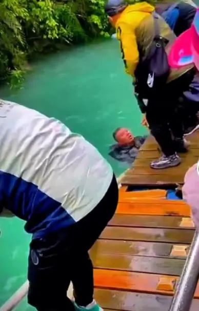 还有乘坐观光车的游客从另一角度拍摄了事发的过程。视频显示,车上的游客本来还在兴致勃勃拿着手机拍摄沿途景色,车辆行驶到栏杆冲断位置时,车辆停了下来,水中靠近桥面的一男一女被游客合力拉上岸。
