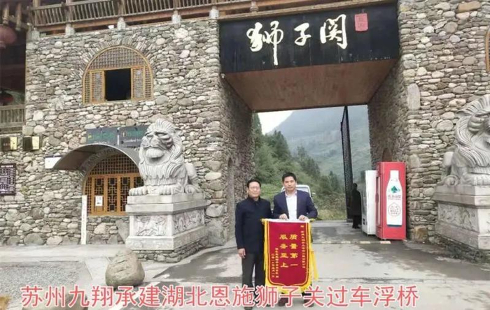 苏州九翔专业水上工程公司在官网的项目案例中将“恩施网红浮桥”作为标杆项目进行展示。展示页面中,还发布了一张落款为“狮子关旅游景区”的锦旗,上面写着“质量第一”。