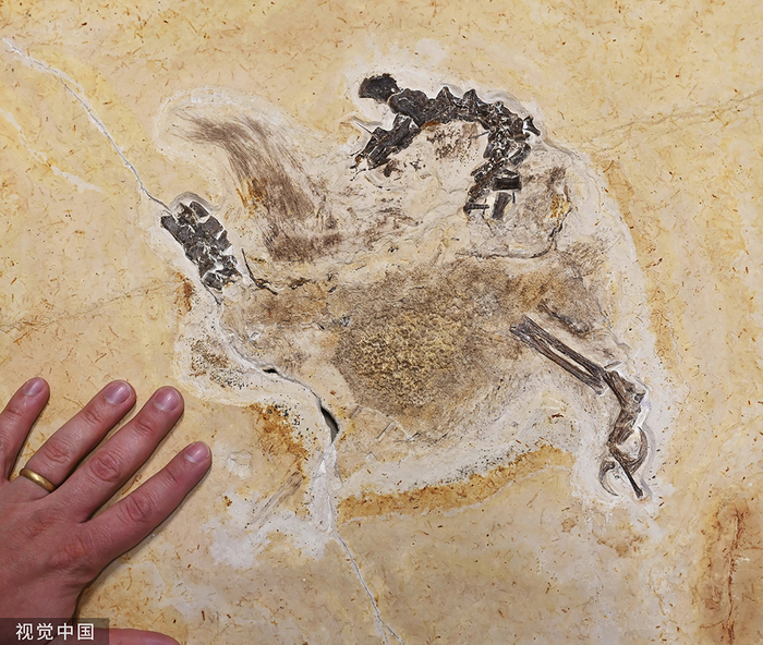 当地时间2023年5月17日,德国巴登-符腾堡州卡尔斯鲁厄,在卡尔斯鲁厄国家自然博物馆展出的“长鬃矛神龙”(Ubirajara jubatus)恐龙化石。