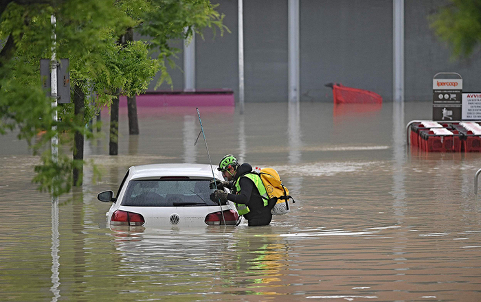 当地时间2023年5月17日,意大利切塞纳,一名救援人员在一家超市附近的汽车里寻找失踪人员。