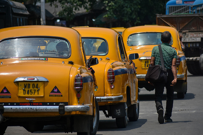 当地时间2023年5月17日,印度加尔各答,道路上的黄色出租车。