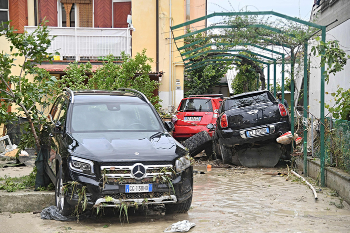 当地时间2023年5月17日,意大利切塞纳,萨维奥河洪水后圣罗科地区被洪水淹没的街道上受损的汽车。