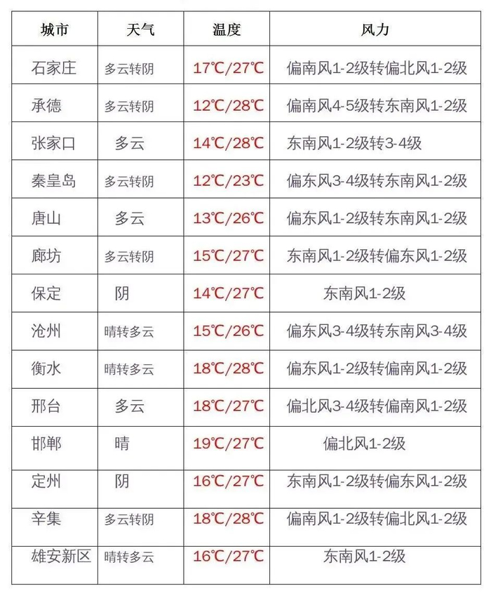 今天白天到夜间,石家庄和保定、廊坊及以北地区阴有雷阵雨或阵雨,其他地区多云。最高温度,张家口北部22~23℃,其他地区24~28℃。最低温度,张家口北部、承德5~10℃,其他地区11~19℃。