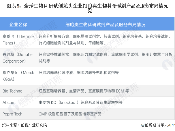 细胞类生物科研试剂占据了全球生物科研试剂市场一半左右的市场份额,以赛默飞、丹纳赫、默克集团等为代表的生物科研试剂行业在细胞类生物科研试剂领域也卓有建树。目前,全球细胞类生物科研试剂的竞争格局与生物科研试剂行业近似,行业市场集中度较高,竞争形式以垄断竞争为主。