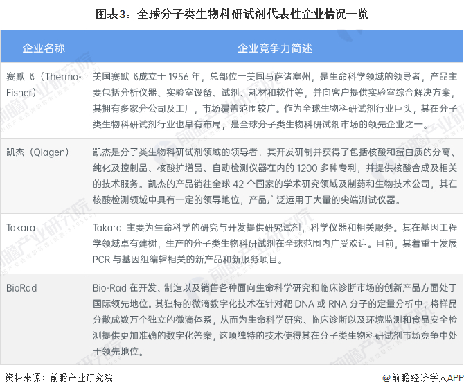 全球分子类生物科研试剂代表性企业主要为赛默飞、凯杰、Takara和BioRad等全球科学服务商。