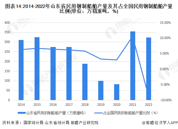 2014-2020年,航运和造船市场持续低迷,山东省民用钢制船舶产量及其占全国民用钢制船舶产量比例呈下降趋势,2020年,叠加新冠疫情影响,山东省民用钢制船舶产量降至83万载重吨。2022年,山东省民用钢制船舶产量为323.89万载重吨,占全国民用钢制船舶产量的比例超过10%。
