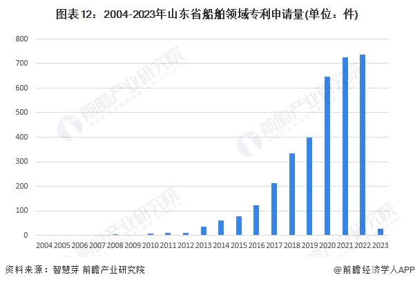 山东省十分注重船舶技术创新,研发能力持续提高。根据智慧芽查询数据显示,自2013年起,山东省船舶领域专利申请量快速增长,2022年,山东省船舶领域专利申请数量为737件,截止2023年4月23日,山东省船舶领域专利申请数量已突破3000件,位列全国第四。整体来看,山东省船舶产业研发能力较强,为船舶产业发展提供了强有力的支撑。