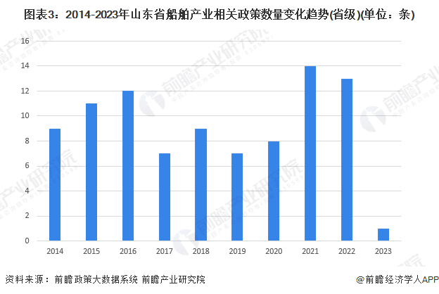 作为造船大省,山东省也十分重视智能化建造在促进船舶行业进一步实现结构调整和转型升级中的重要作用,“十三五”以来政策积极引导造船企业建立智能制造新模式,在重点造船企业推进智能生产线改造,实施机器换人工程,快速提升船舶建造质量和效率,降低成本和资源能源消耗,实现提质增效。2014年以来,山东省每年发布的船舶产业相关政策都在5条以上。
