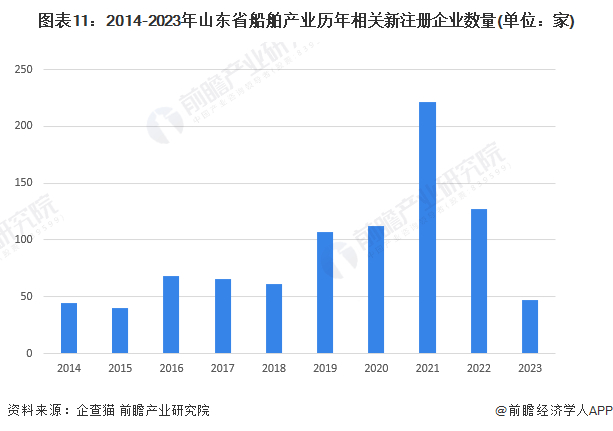 作为沿海省份,山东省发展船舶产业具有天然的地理优势,其船舶产业发展基础位居全国前列,吸引力众多船舶产业企业落地。根据企查猫查询数据显示,2014-2023年,山东省船舶产业新增注册企业数量整体呈上涨趋势,2014-2023年新增注册企业数量共894家,2021年新增注册企业数量为历年最多,达221家。整体来看,山东省船舶行业企业数量增长较快,发展较有活力。