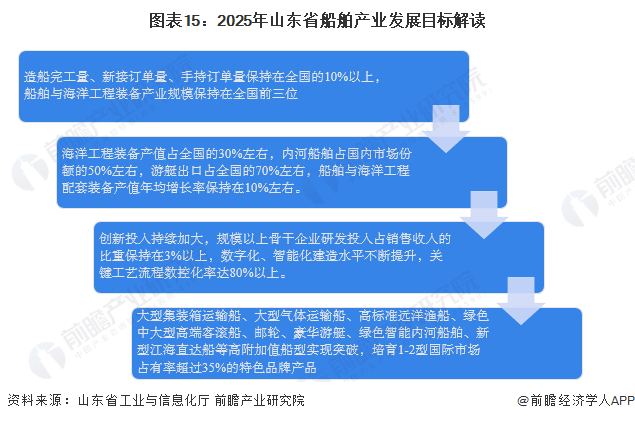 根据《山东省船舶与海洋工程装备产业发展“十四五”规划》,到2025年,山东省造船完工量、新接订单量、手持订单量保持在全国的10%以上,船舶与海洋工程装备产业规模保持在全国前三位。海洋工程装备产值占全国的30%左右,内河船舶占国内市场份额的50%左右,游艇出口占全国的70%左右,船舶与海洋工程配套装备产值年均增长率保持在10%左右。创新投入持续加大,规模以上骨干企业研发投入占销售收入的比重保持在3%以上,数字化、智能化建造水平不断提升,关键工艺流程数控化率达80%以上。大型集装箱运输船、大型气体运输船、高标准远洋渔船、绿色中大型高端客滚船、邮轮、豪华游艇、绿色智能内河船舶、新型江海直达船等高附加值船型实现突破,培育1-2型国际市场占有率超过35%的特色品牌产品,核心配套装备领域形成一批具有自主知识产权的品牌产品。