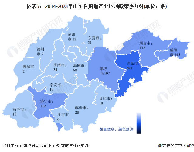 除省级产业政策外,山东省下辖16个地级市也通过出台相关产业发展政策,助推地区船舶产业发展。从山东省16个地级市2014年至今发布的船舶产业相关政策数量来看,青岛市发布的船舶产业相关政策数量最多,为683条,在政策支持下,青岛市成为了山东省船舶产业发展高地。此外,威海市、烟台市发布的船舶产业相关政策数量也较多,分别位列第二、第三。