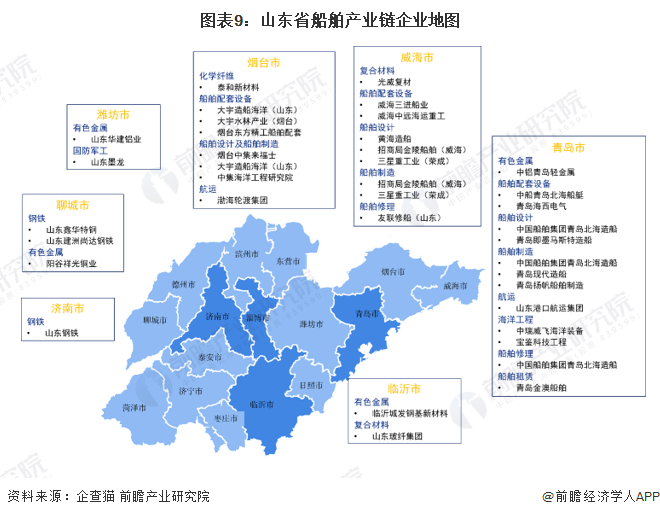从产业链环节企业分布来看,上游企业中,钢铁及有色金属企业聊城市分布最多,济南有上市公司山东钢铁 ; 复合材料企业中,碳纤维上市公司光威复材在威海市,玻璃纤维上市公司山东玻纤集团在临沂市;船舶配套设备及船舶设计企业主要分布在青岛市、威海市、烟台市; 中游船舶制造企业分布最多的是青岛市、烟台市、威海市,其中青岛市有全国知名企业中国船舶集团青岛北海造船。下游航运企业分布最多的是青岛市;海洋工程企业分布最多是是青岛市;全国知名上市国防军工企业山东墨龙在潍坊市;船舶修理企业分布最多的是青岛市和威海市;船舶租赁企业分布最多的是青岛市。