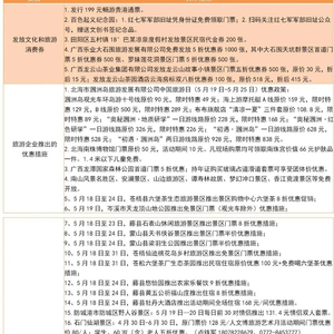 5月19日,崇左雨花石景区门票半价优惠。天琴壮寨-红军古道景区门票免费。龙州县红八军军部旧址景区门票免费。