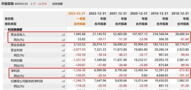 数据显示,该公司2019年到2022年营收下滑明显,2019年-2022年,华丽家族营业收入分别为23.46亿元、10.8亿元、5.25亿元、2.11亿元。