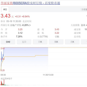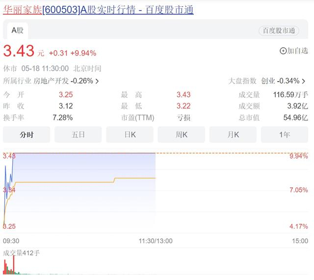18日,华丽家族开盘迅速拉升至涨停,最新报价3.43元,这是该股本周的第二个涨停板。