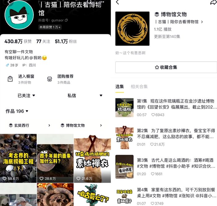 2021年,抖音号“古猫陪你去看博物馆”正式上线,一来是疫情原因,导致博物馆电子讲解收入锐减,二来是汤诗伟看到了短视频巨大的潜力。“文物不仅要听,也要看,故事必须结合实物才行。”汤诗伟说,“甚至可以说有了短视频,从获取知识的层面来说,在家看抖音和逛博物馆是差不多的,所以无论如何,我们都要把账号做起来。”