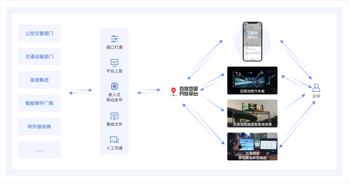 一方面,百度地图从政企合作部门获得权威、可靠、及时的交通数据信息,通过百度地图App、百度车机地图、道路诱导屏、交通广播等形式,将动态交通事件、信号灯倒计时、实时公交等权威交通信息传递给公众,服务用户出行。