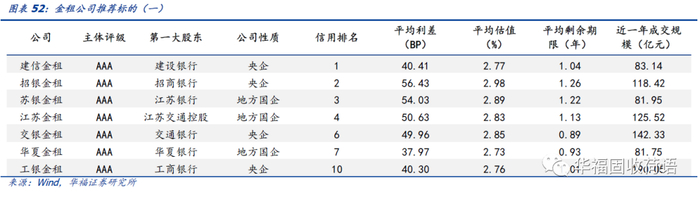 此外,对于有一定风险偏好,有一定收益要求的投资者,建议关注AAA级、国有性质、强股东背景的金租公司,优质股东背景能公司带来业务和资金上的支持,例如光大金租、浙江浙银金租、福建海西金租,信用利差在70BP-130BP左右。
