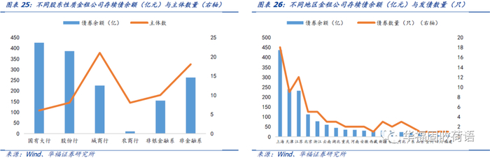 从股东性质来看,少数国有大行和股份行发行债券的数量占比超一半,股东背景为城商行的金租公司存续债余额相较其数量占比较小。以国有大行、股份行、城商行、农商行、非银金融机构、非金融系为股东的金租公司分别有6、8、21、8、10、18家,债券余额分别为425亿元、386亿元、224.5亿元、10亿元、154亿元、261.98亿元。从区域分布来看,上海、天津、江苏金租公司发行债券余额最高分别为436亿元、240亿元和230.98亿元,占比分别为29.83%、16.42%和15.8%,发行债券只数分别为18只、9只和12只。其中福建金租公司发行债券余额最低为5.5亿元。