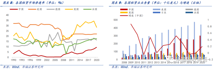 我国租赁行业起步较晚,市场渗透率不高,但市场体量较大,未来发展空间大。虽然近年来我国租赁行业渗透率处于波动上升的态势,但与发达国家相比我国融资市场的渗透率仍处于低位。2020年我国租赁行业市场渗透率为9.4%,而美国、德国、英国和法国此指标数值分别为22%、16.2%、28.4%和17.5%,可见我国的租赁市场的渗透率水平较其他发达国家仍有较大的差距。